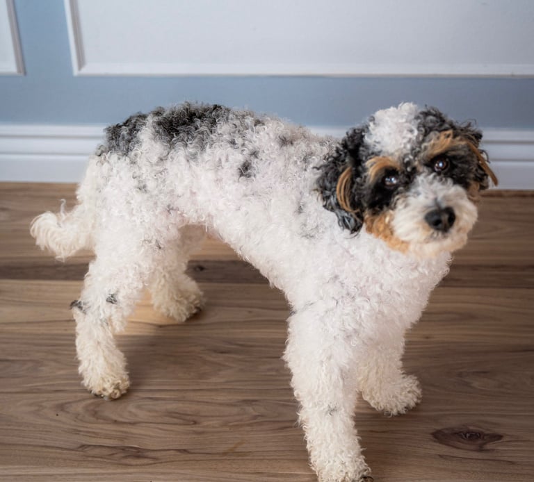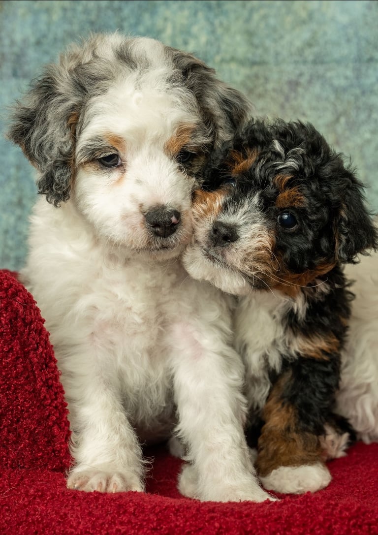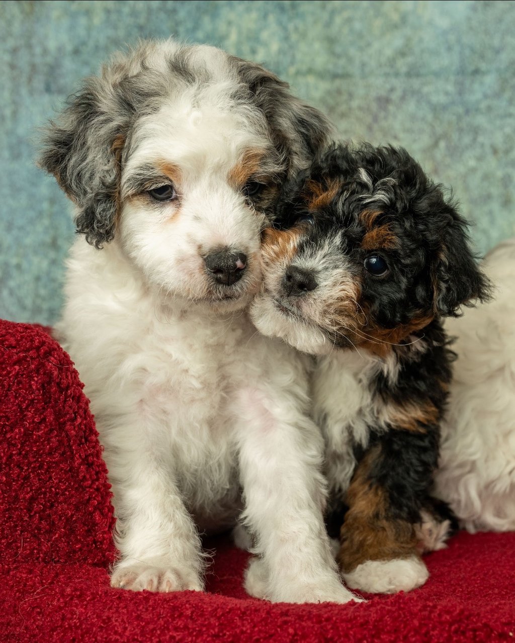 This exceptional poodle stud is an ideal match for Bernese Mountain Dogs, Bernedoodles, Australian Shepherds, Aussiedoodles, King Charles Cavaliers, Cavapoos, and Cavadoodles. As an experienced breeder of tri-colored puppies, I specialize in producing top-quality Bernedoodles, Cavapoos, and Aussiedoodles. Many of Bandit’s offspring have striking blue eyes, and about half inherit his incredible Merle genes.