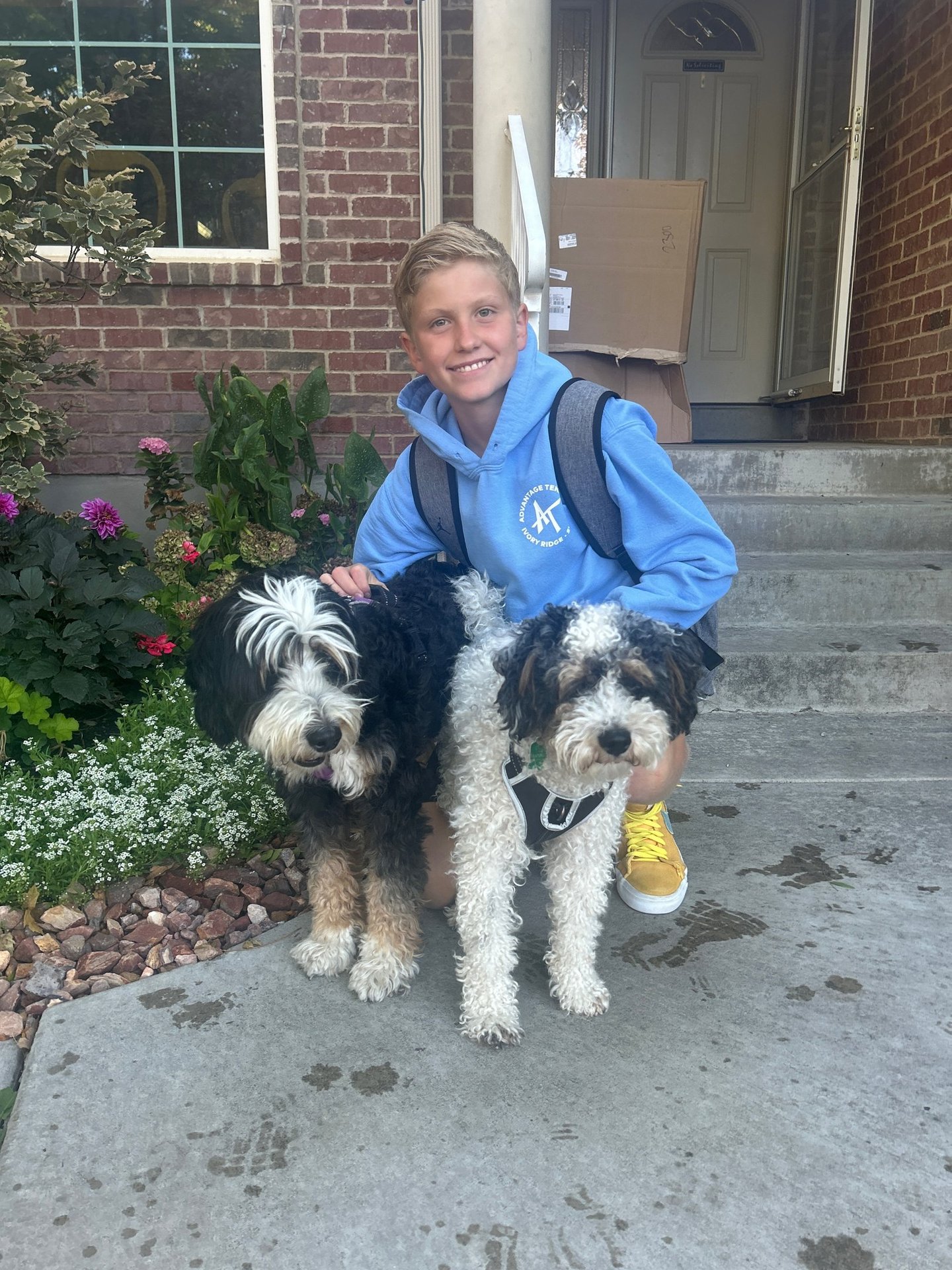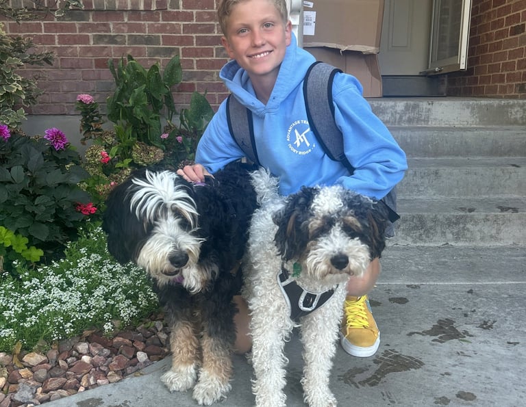 We are based in Springville, Utah, and have been dedicated to breeding high-quality doodles for many years. Our stud, Bandit, is a cherished member of our family and lives with us in our home. Whether joining us on our outdoor adventures, accompanying us on errands, or keeping pace during our daily 3-mile runs, Bandit is always by our side, demonstrating his loyal and affectionate nature. We love assisting others with their breeding questions, so feel free to reach out. Our mission is to blend excellent health, genetics, temperament, and longevity to ensure your puppies are perfect for their future families. Feel free to reach out—we love connecting with others who share our passion for these wonderful dogs!